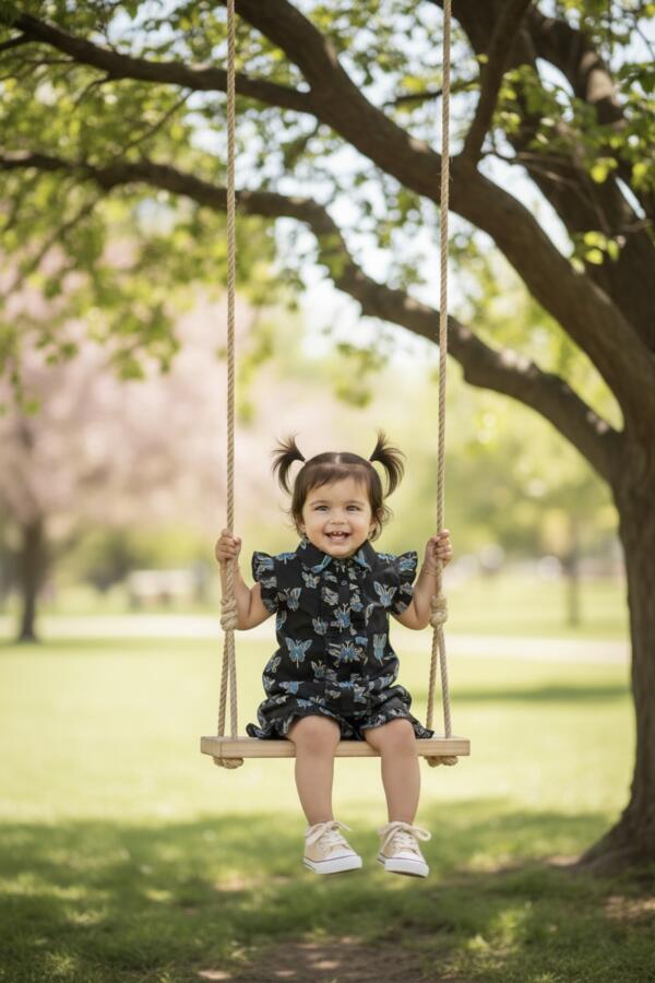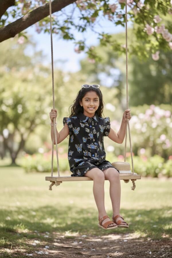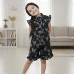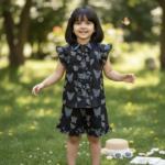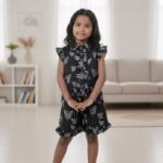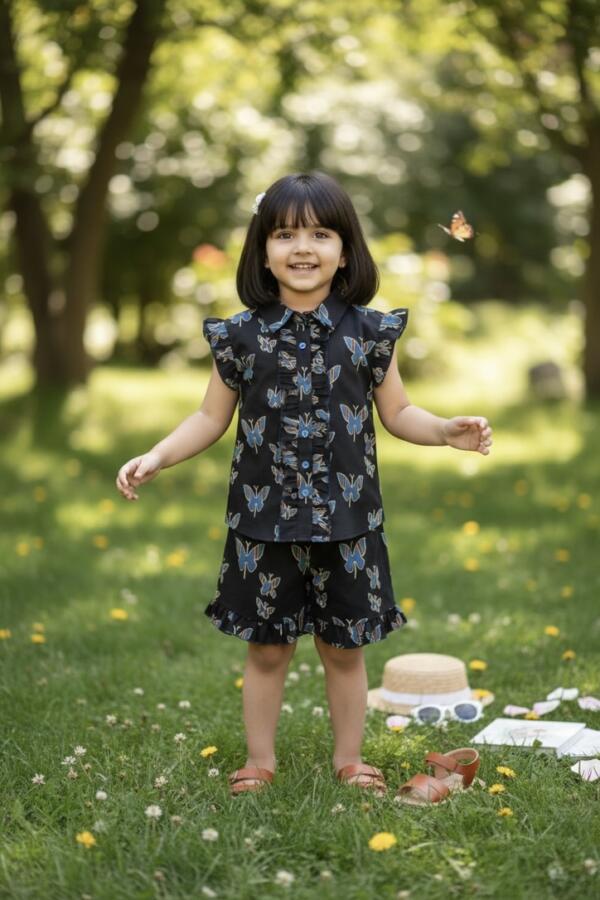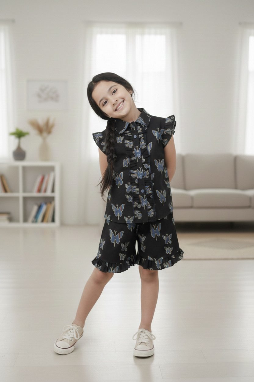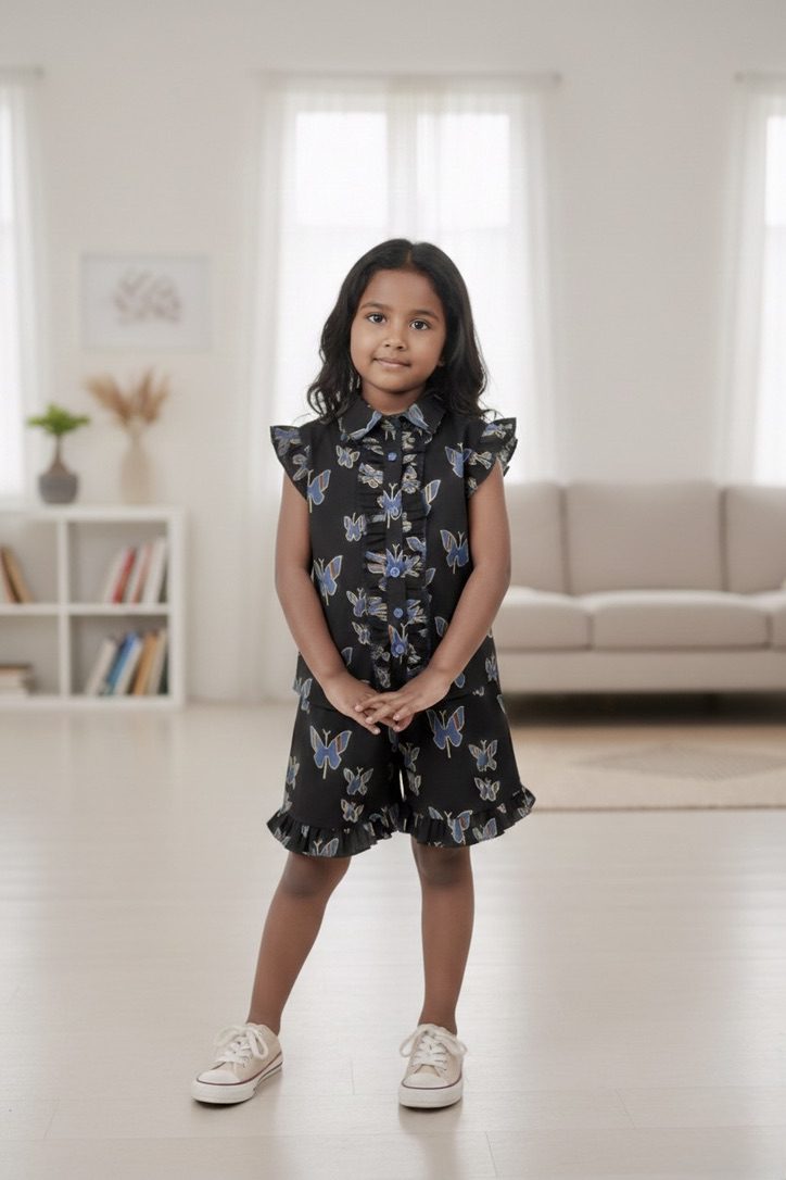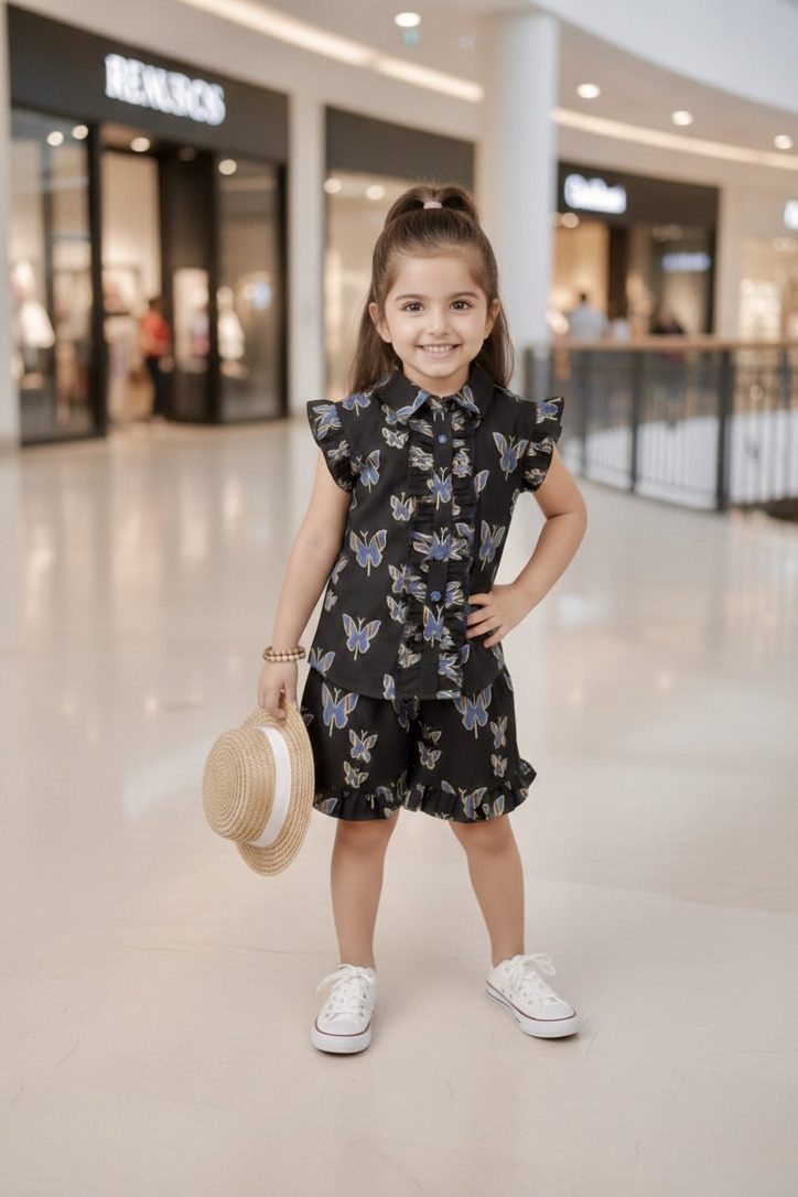 A stylish butterfly-print co-ord set designed for little trendsetters. Made from soft, breathable fabric with cute ruffle sleeves and comfy shorts, it’s perfect for playdates, outings, and fun outing days.