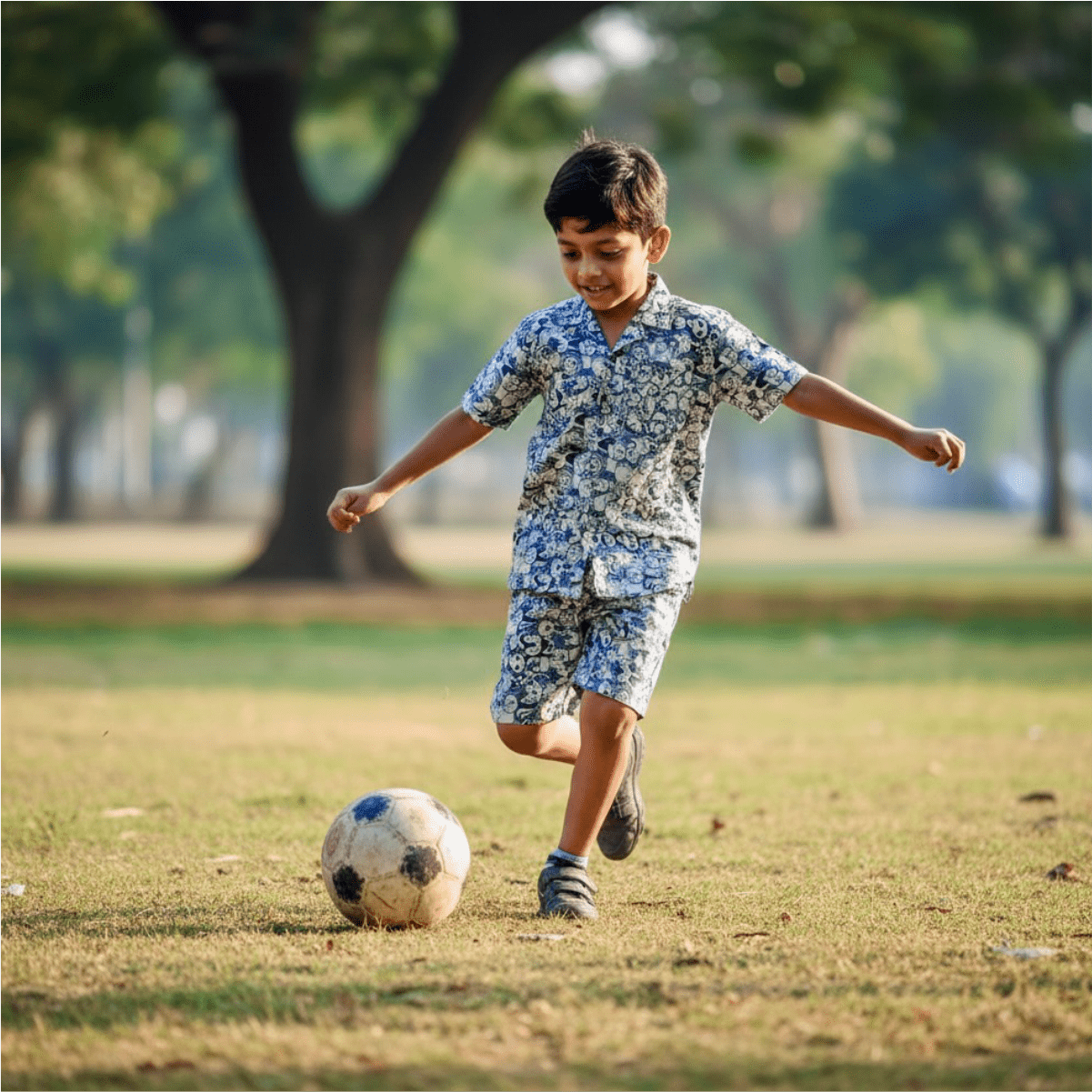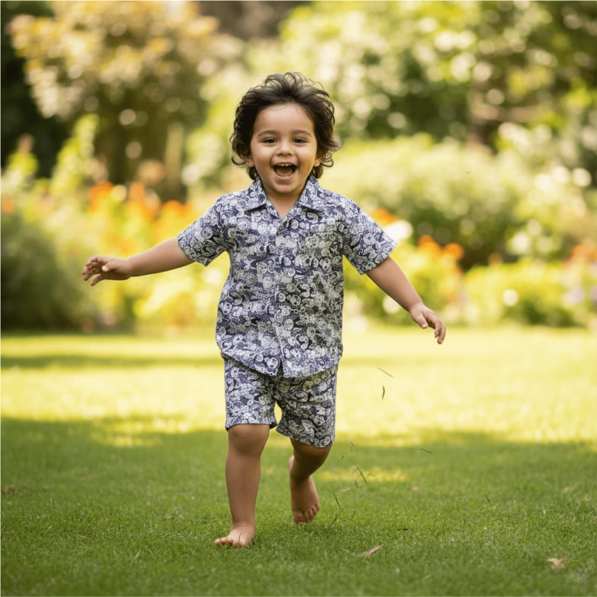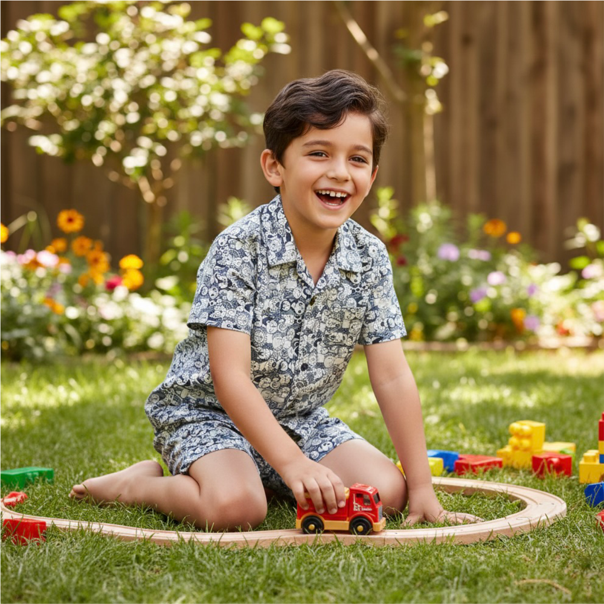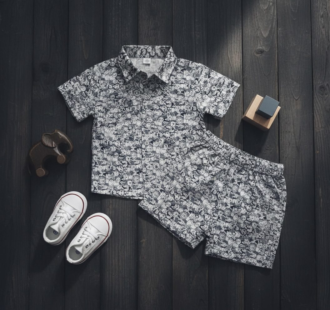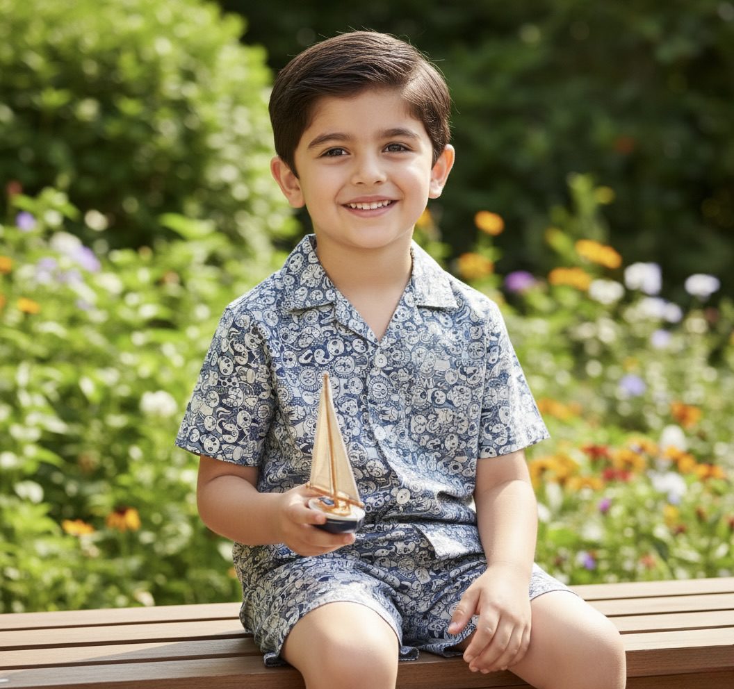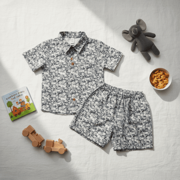 Spark joy and adventure with this subtle grey co-ord set, featuring a playful doodly animal print that is as spirited as your little one.Designed for endless fun, this breezy cotton shirt and matching shorts duo offers a smart-casual look perfect for garden play and sunny afternoons.