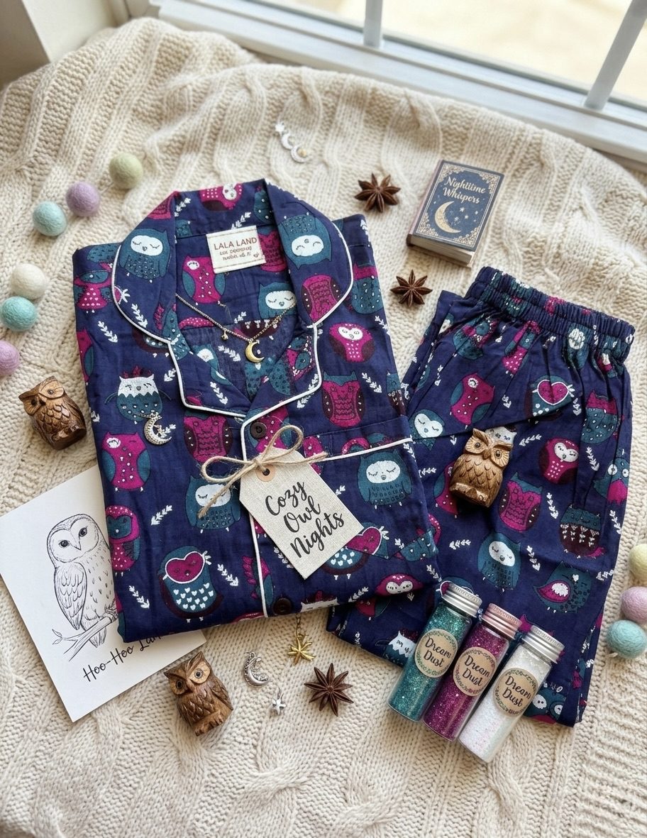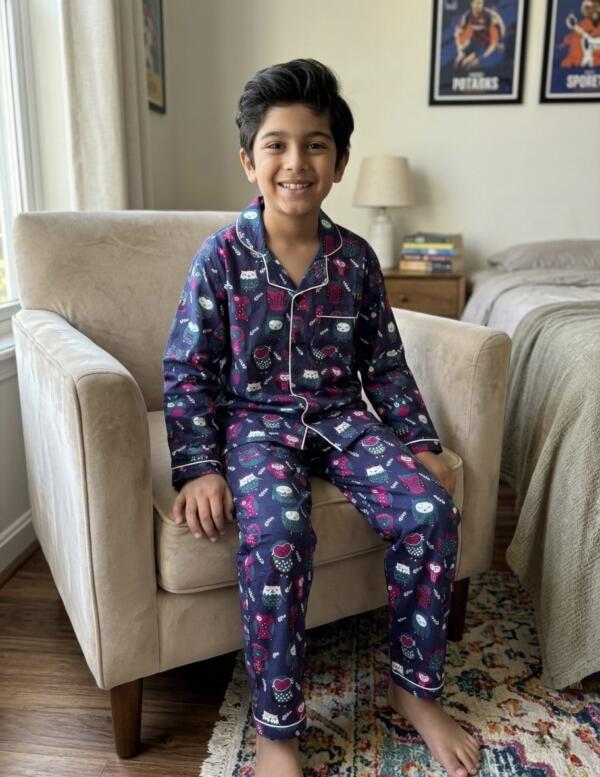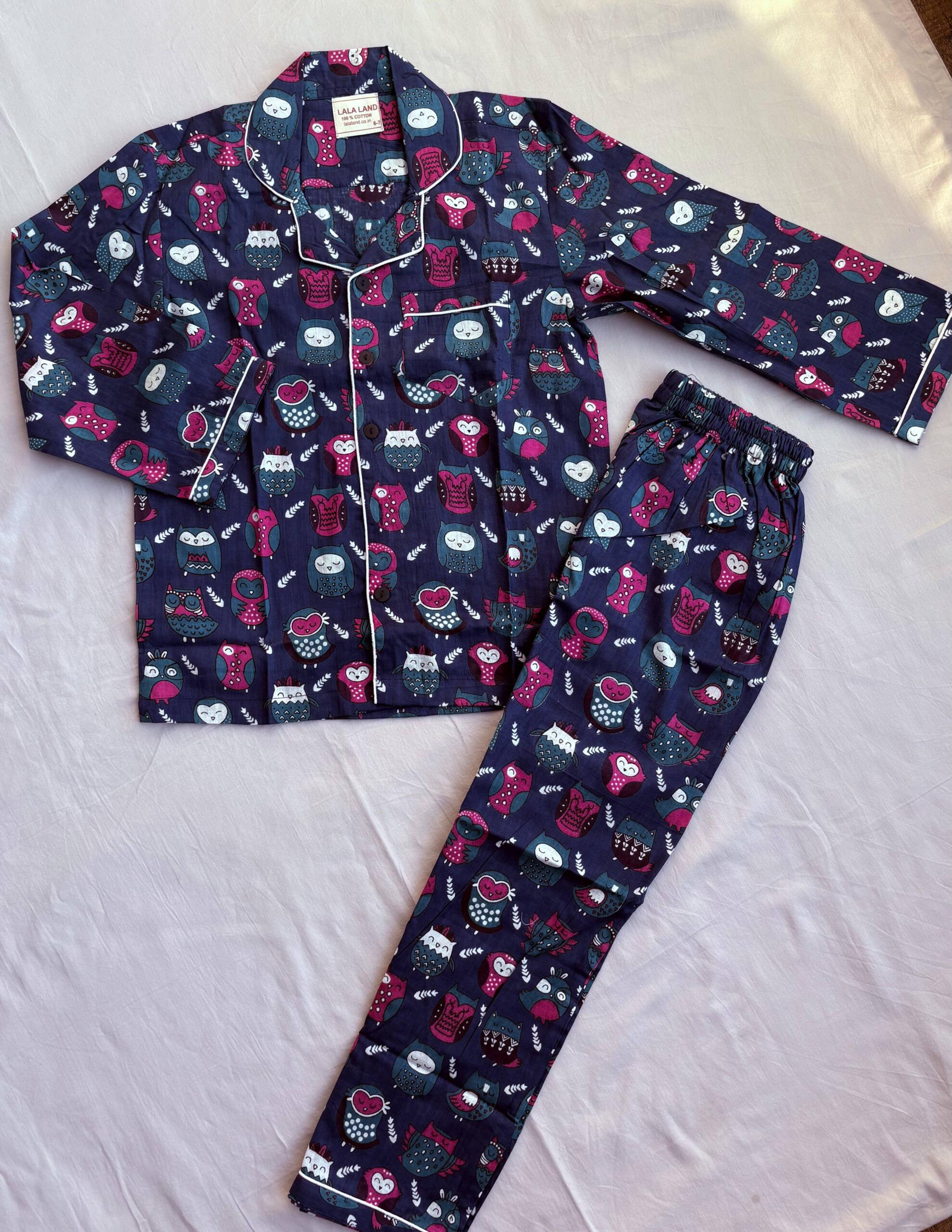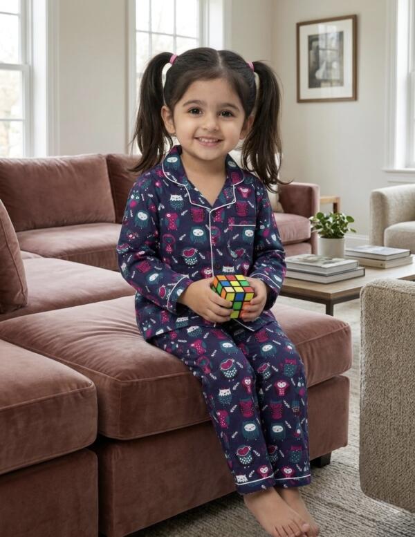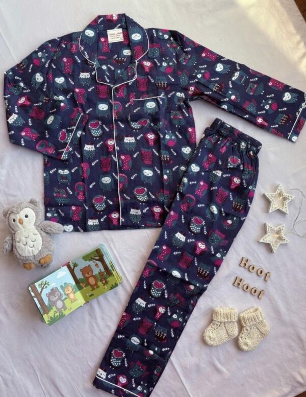 A cozy cotton nightsuit covered in adorable owl prints for the cutest bedtime vibes. Soft, breathable, and gentle on little skin, this comfy set features a classic button-down shirt and relaxed pants—perfect for snuggly nights and dreamy sleep.