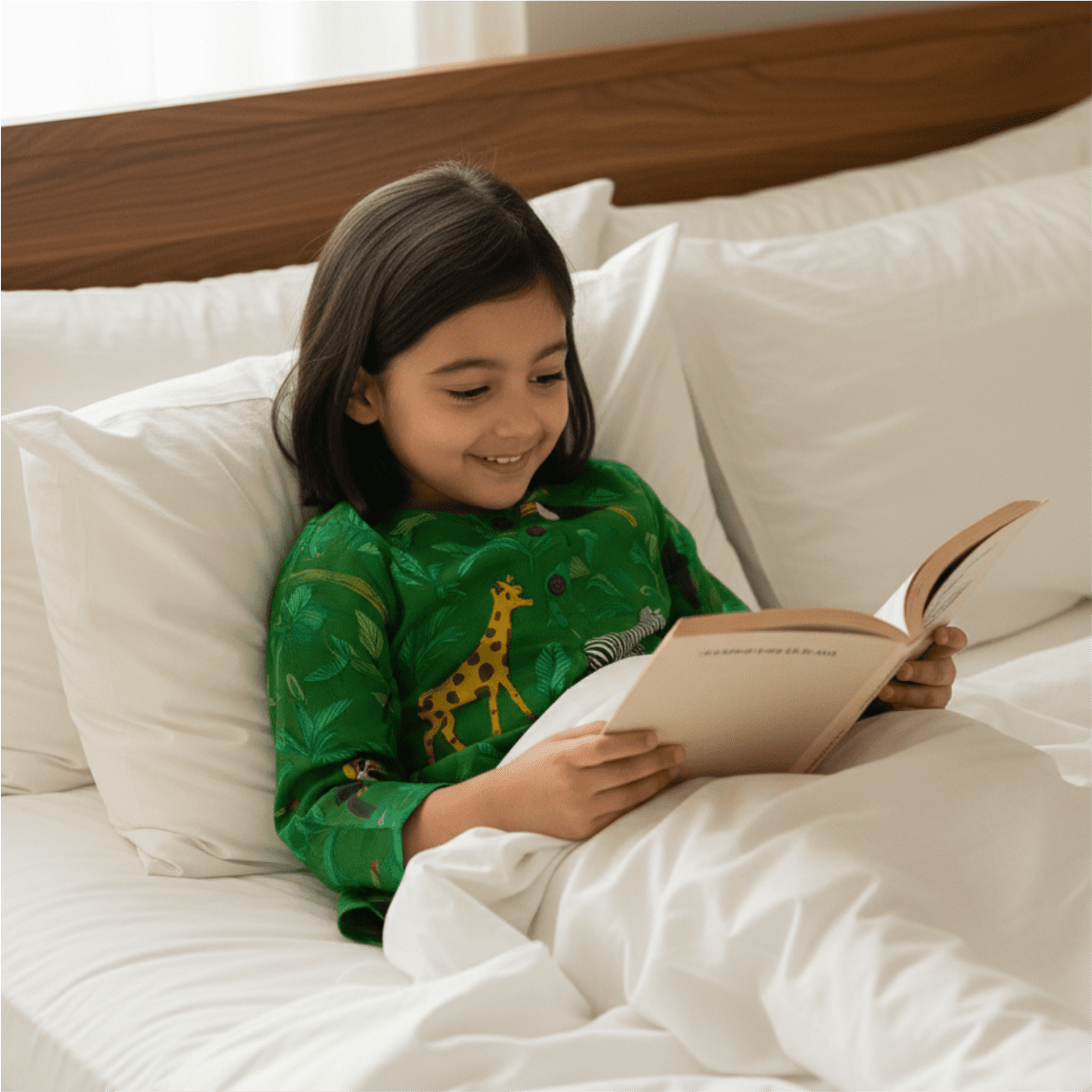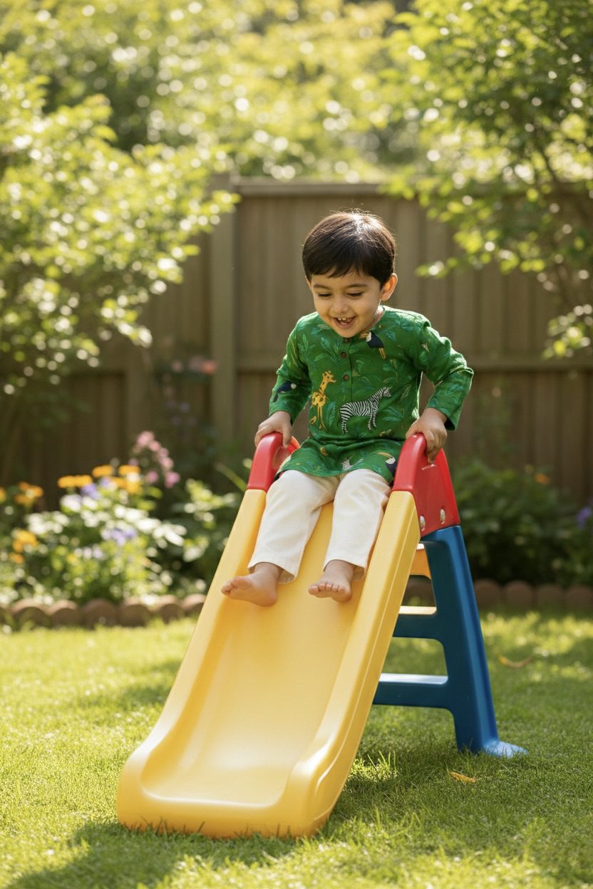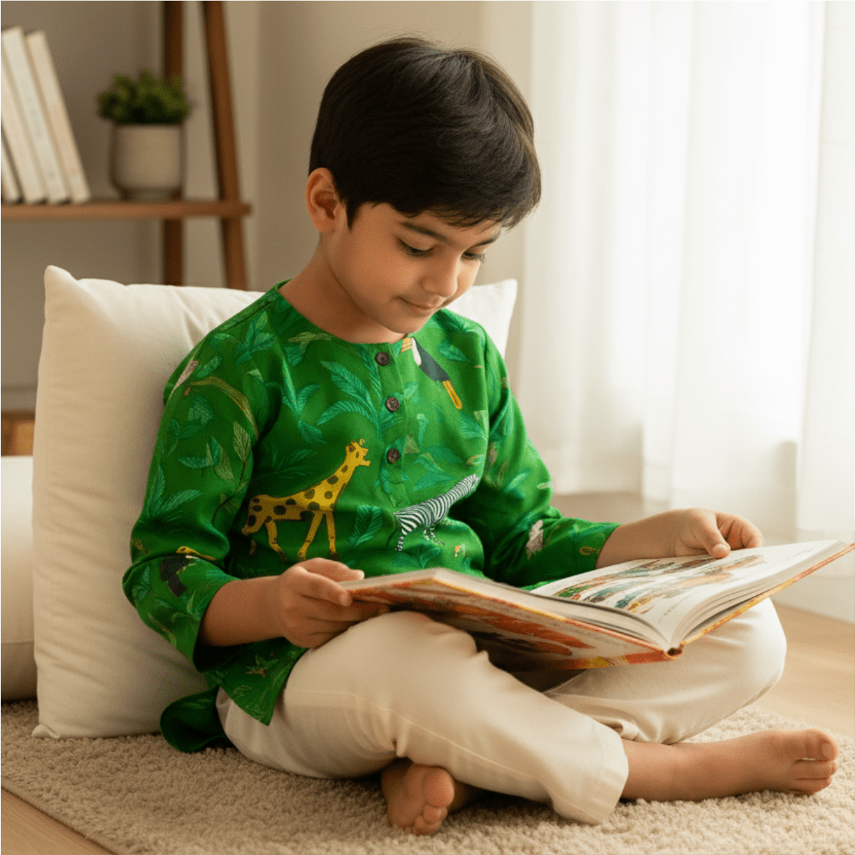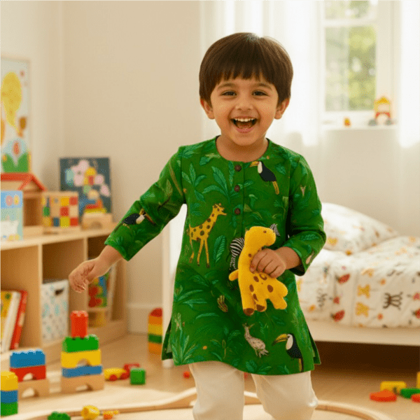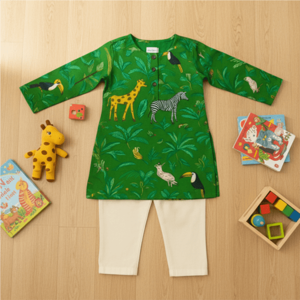 Step into a world of imagination with this lush, jungle-inspired tunic set, showcasing a vibrant green landscape filled with zebras, giraffes, and exotic birds.Beautifully balanced with soft, cream-toned trousers, this ensemble offers a heartwarming blend of adventure and comfort for your little one’s daily discoveries.