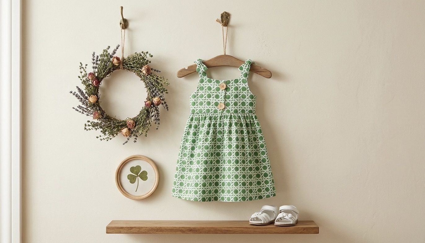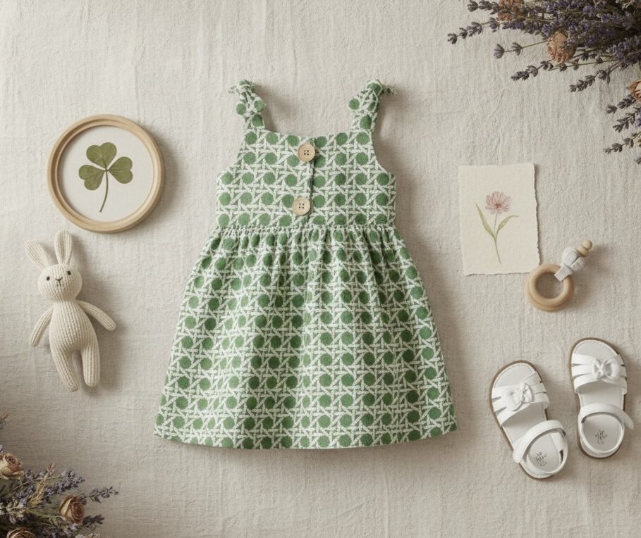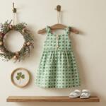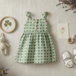 A charming green printed cotton dress designed for comfort and play. Featuring cute bow shoulder straps and wooden button details, this lightweight dress is perfect for everyday wear, outings, and playdates. Soft, breathable fabric keeps your little one cool and happy all day long.