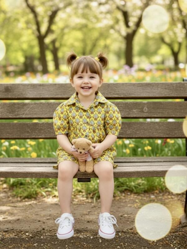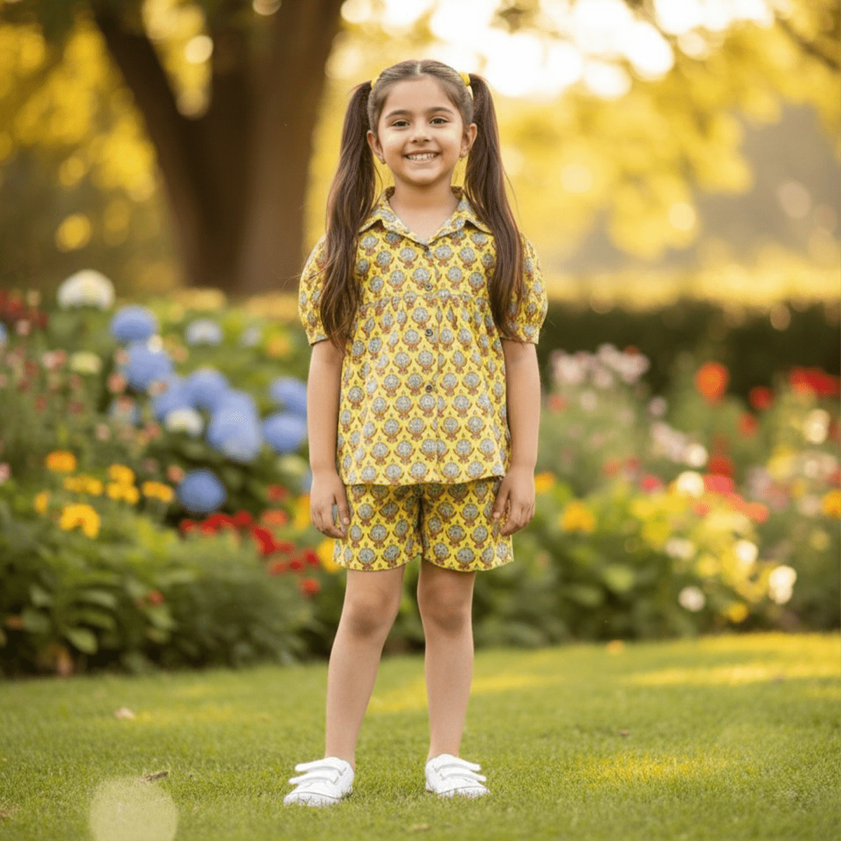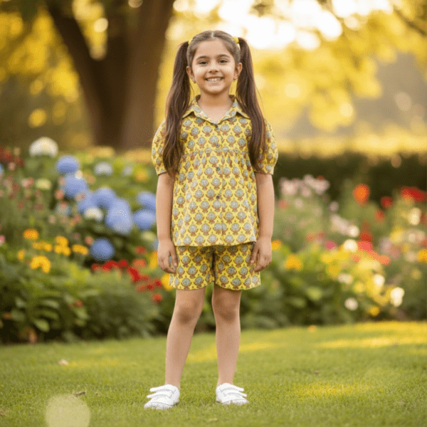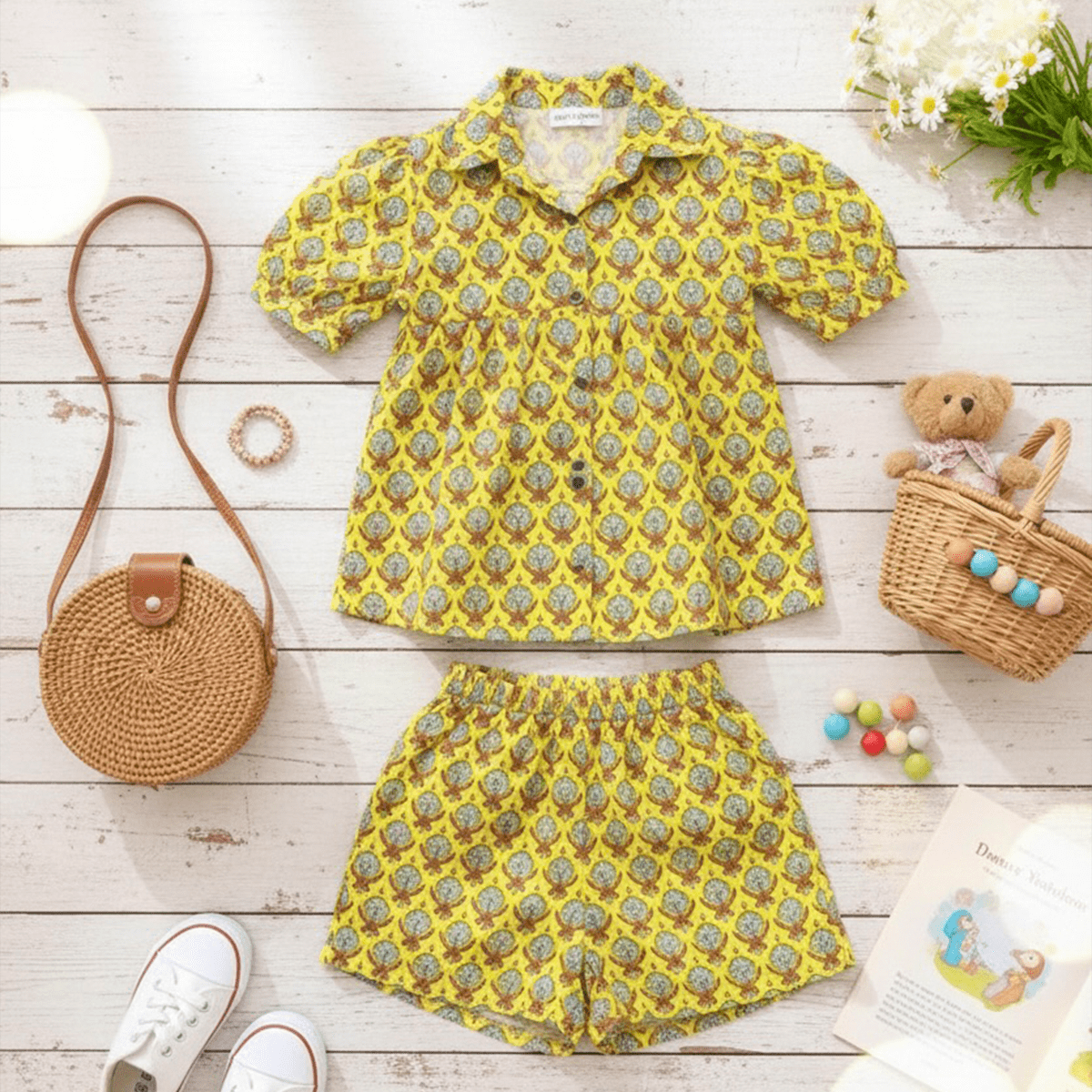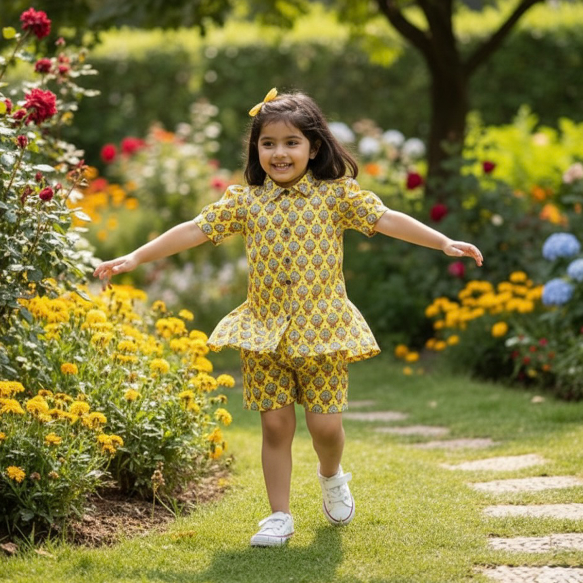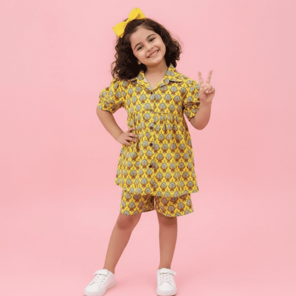 Bright, bubbly and full of sunshine, this yellow printed co-ord set is made for little girls who love to shine. With its comfy fit and playful vibe, it’s perfect for twirls, giggles and happy all-day adventures.